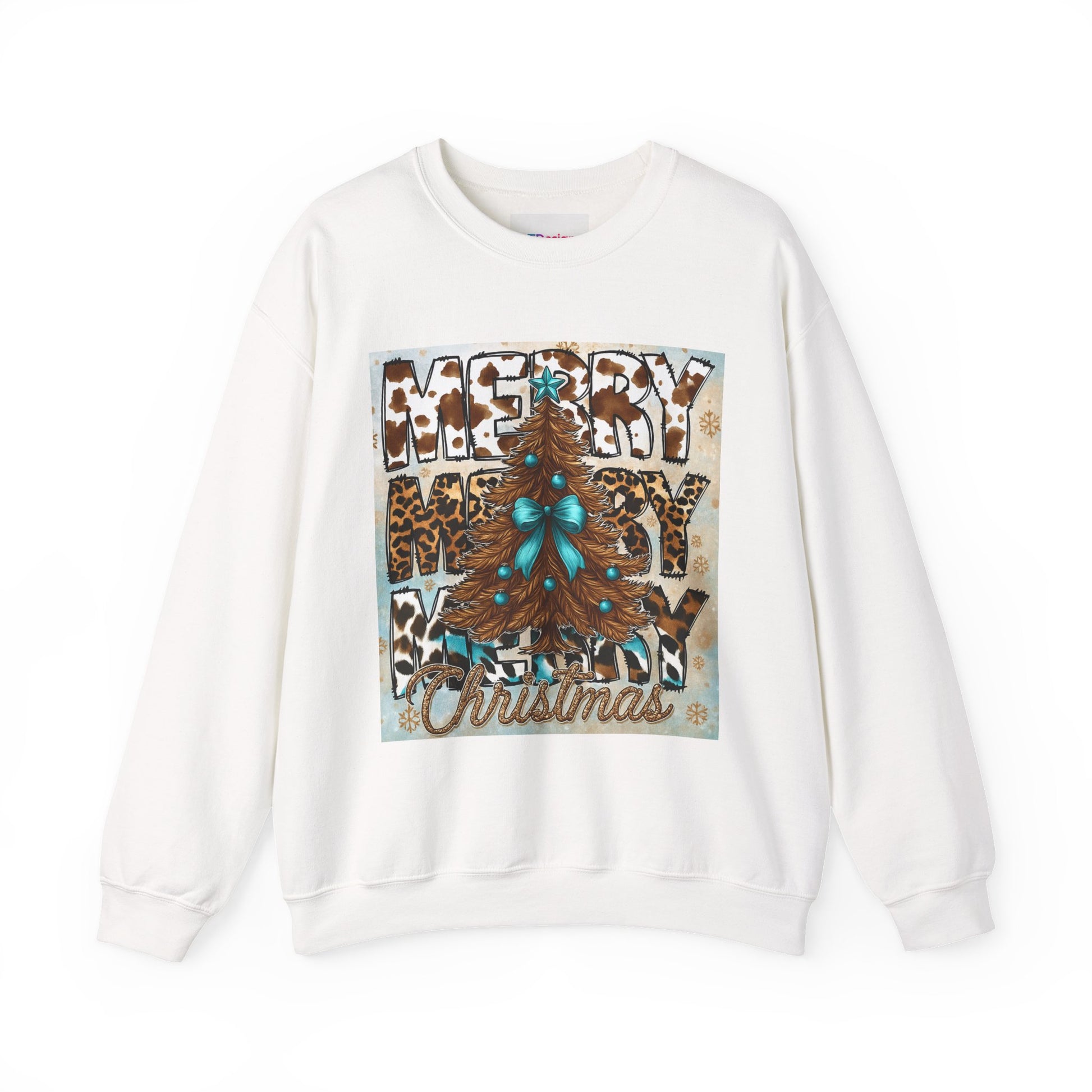 Christmas Crewneck Sweatshirt — "Merry Merry Christmas" Leopard Tree Holiday Pullover